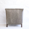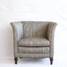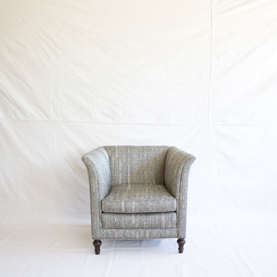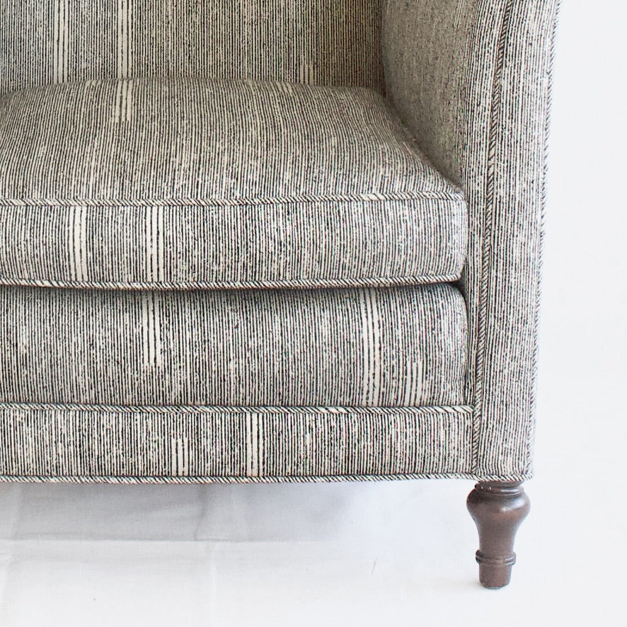 Striking accent chair upholstered in the Tailor cotton/linen blend fabric from Fayce Textiles